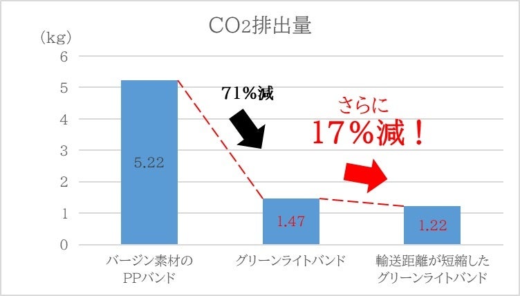 東京を起点とした場合、PPバンド1kgあたりのCO2排出量は、従来の1.47kg-CO2から、1.32kg-CO2へと17%削減されました。これは、製造業におけるサプライチェーン排出量(Scope 3)の把握と削減への関心が高まる中、大きな成果と言えます。