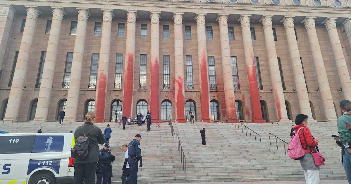 Helsinki, Finland – In a dramatic demonstration demanding action on climate change, environmental activists from Elokapina (Finland) and Restore Wetlands (Sweden) splattered the walls and pillars of the Finnish Parliament House with red paint on Wednesday morning.