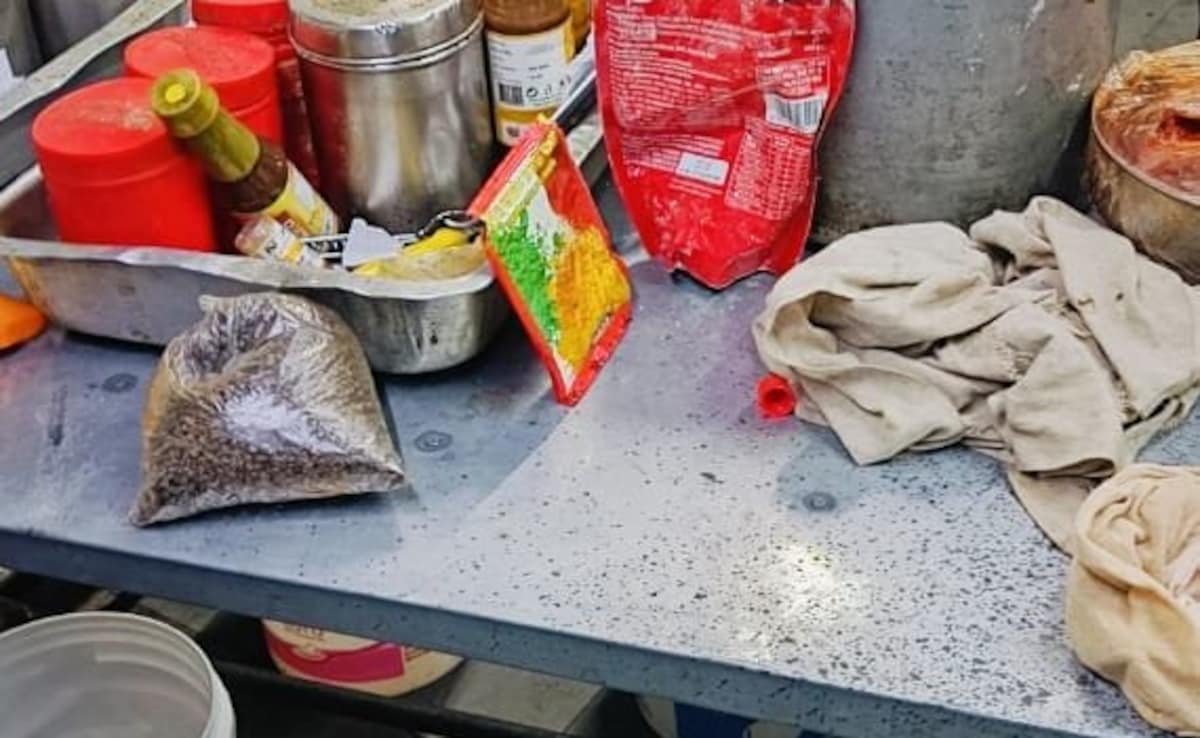 The inspection revealed serious hygiene lapses, including a cockroach infestation, water seepage, broken refrigerators, rusted joints, and clogged drains. Unlabelled food items were found stored in the kitchen, with beetle infestation discovered in wheat flour and urad dal. Open dustbins without lids and the use of synthetic food coloring in Chinese dishes further raised concerns.