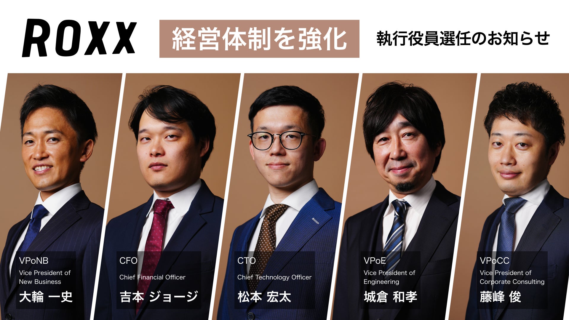 * **George Yoshimoto (Executive Officer, CFO / Chief Financial Officer)**: Qualified as a Certified Public Accountant (Montana, USA) while still a student. Joined Mitsubishi UFJ Bank, Ltd. in 2013 and later worked at Lazard Frères, a US investment bank. Co-founded Spicecode Inc. and led its two-step exit to Seki-Tsu Co., Ltd. (9326) before joining ROXX in 2023.
