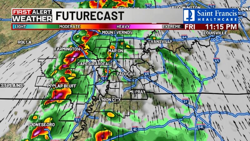 Following a brief reprieve Saturday morning, another round of rain and thunderstorms is expected to develop across the region, moving from southwest to northeast. The greatest risk of severe weather on Saturday will be along the eastern edge of the viewing area, particularly in northwest Tennessee and parts of western Kentucky.