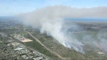 **BOURNE, MA** – A planned burn at Joint Base Cape Cod spiraled out of control Thursday afternoon, sending a large plume of grey smoke billowing into the sky and prompting a massive response from local and state fire departments. While the fire originated within a designated burn area intended for forest fire mitigation, officials confirmed the flames spread beyond its boundaries, remaining contained within the base property.