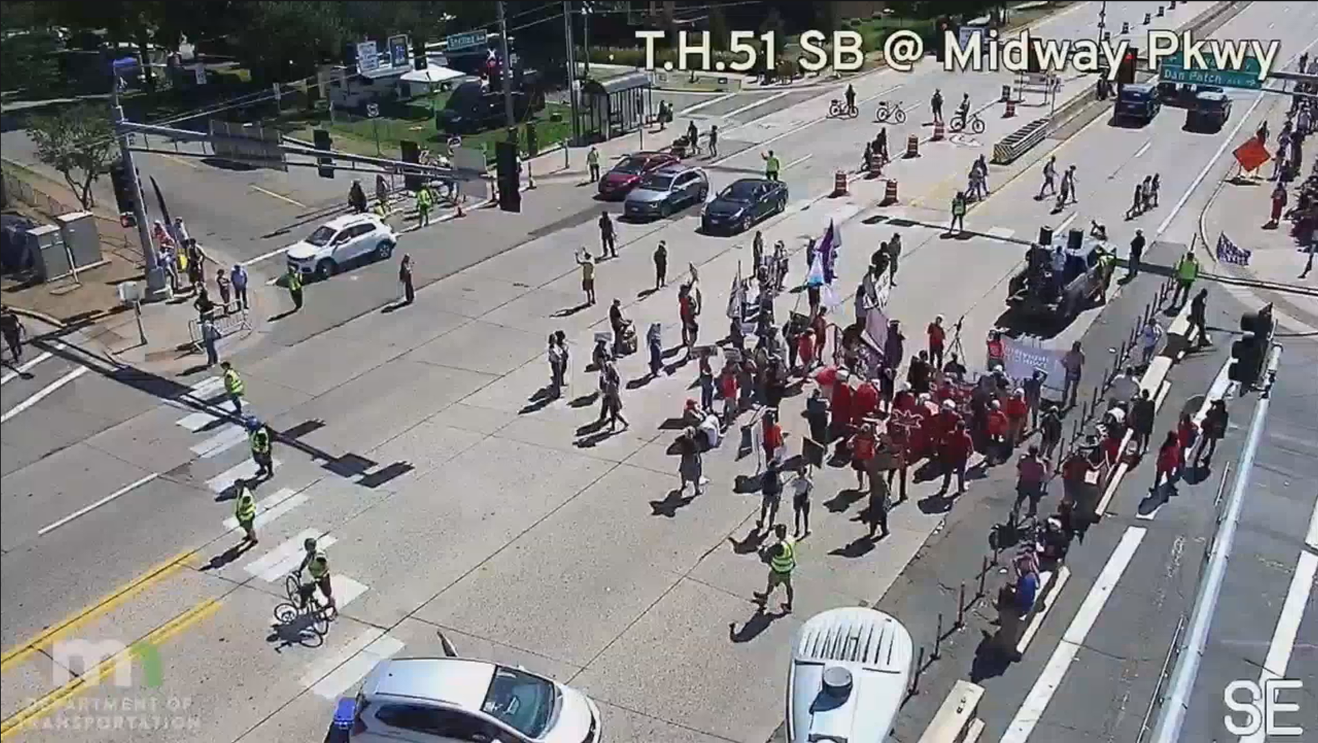 The closure, which began shortly after 1:00 PM CDT, affected access to the fairgrounds as demonstrators gathered near the gate. Traffic cameras showed the group, numbering in the dozens, holding signs, including one reading “Boycott Target.” The group did not appear to be attempting to enter the fair.