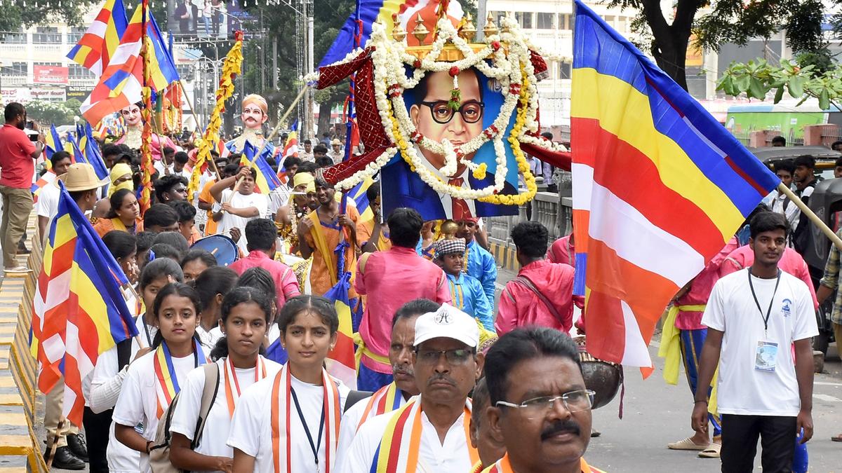 The convention began with tributes paid to the idol of Buddha and the portrait of B.R. Ambedkar. Following the tributes, a grand procession took place from the Town Hall to the Maharaja’s College Grounds. The procession, which featured an idol of Buddha carried on a flower-bedecked chariot and accompanied by folk troupes, was flagged off after paying respects to the statue of Ambedkar at the Town Hall premises.