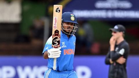 In a match held in Bulawayo, Zimbabwe, as part of the ICC Men’s Under-19 World Cup, India defeated New Zealand by seven wickets using the Duckworth-Lewis-Stern (DLS) method. The Indian team won the toss and chose to field first. Due to rain, the match was reduced to 37 overs. New Zealand was all out for 135 runs in 36.2 overs, setting a target of 136 runs for India in 37 overs.