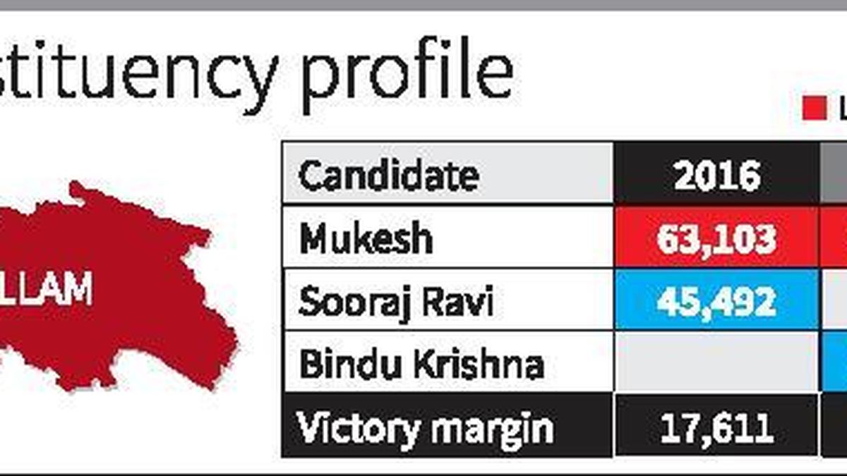 - In the 2021 Assembly elections, LDF’s M. Mukesh narrowly defeated UDF’s Bindu Krishna by 2,072 votes.