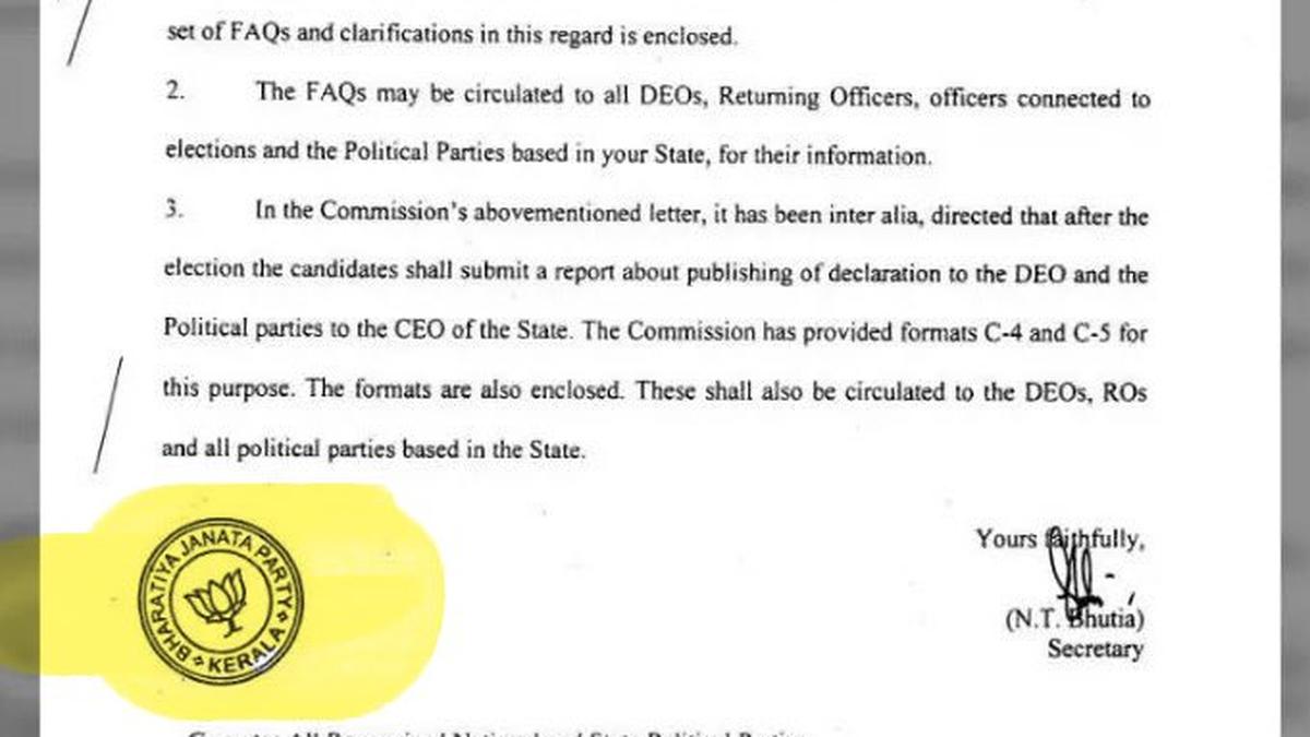 - A 2019 ECI letter with the BJP Kerala unit seal was distributed to political parties.
